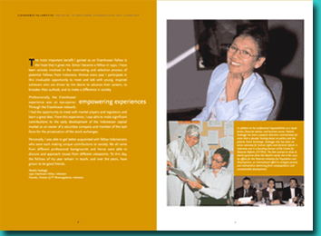 Solution: Each year, Eisenhower Fellowships, with Jana’s help, produced an annual report that highlighted Fellows, the previous year’s events and financial information. But as the organization headed toward its 50th anniversary celebration, Jana urged EF to take a different tack, to produce a brochure that featured the people who had benefited from the fellowships and details about the programs. The brochure would last several years, saving the organization money, while the financial information could be contained in a small, folded brochure printed annually.